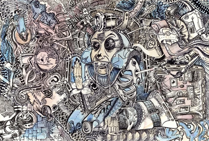 Gilbert Leiker was born in 1974 in the north-western United States. He was almost immediately captured by robots and forced into a life of continuous illustration and time travel. During the day he works as a designer and animator for a large gaming (gambling) company. Once the working day is over, he heads to Sub-Bunker 15 and his drawing table at MOTHbot Central where, under the baleful gaze of the MOTHer O.N.E. Central Synaptic Processing Network, he must draw and draw and draw. In exchange, the robots keep Gilbert entertained with a steady flow of comic books and zombie movies. He has a cat assistant programmed to help him stay on task. Recently, Gilbert has become a professional time-traveller.